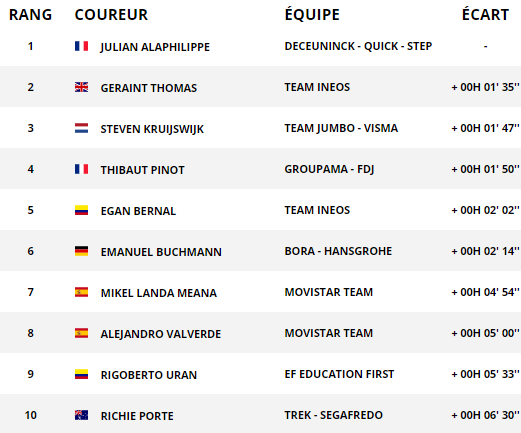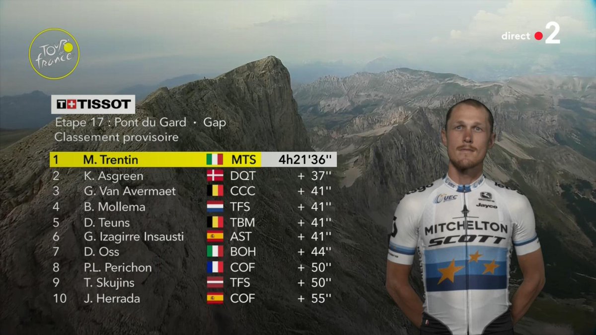 Top 10 du jour. C'est globalement les plus costaud de l'échappée de 34 qui sont présents. Mais Trentin était si fort qu'il aurait pu l'emporter dans n'importe quelle configuration de course. 2 Cofidis dans les 10 pour les français, dont un PLP qui aurait mérité mieu