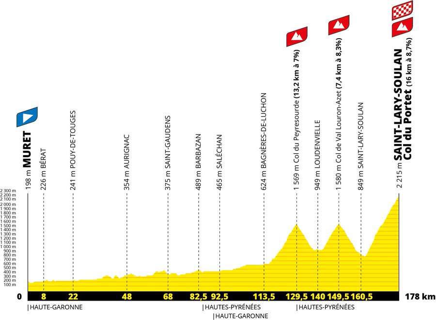La 17e étape part de Muret pour rejoindre le Col de Portet, pour la 2e fois au programme du Tour après 2018. Les cols de Peyresourde et Azet serviront d'échauffement avant ce monstre