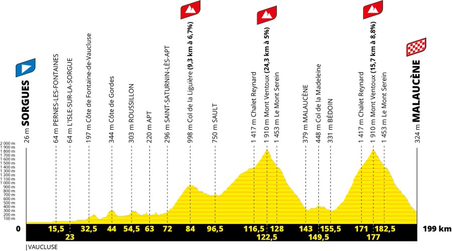 La 11e étape dans le Vaucluse promet avec une double ascension du Ventoux, d'abord par Sault puis par le versant classique de Bédoin. L'arrivée sera jugée en bas de la descente à Malaucène