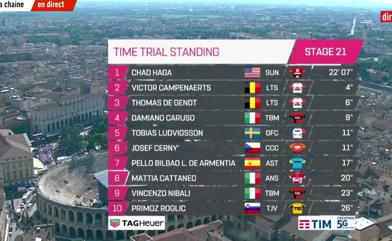 Chad Hage remporte ce chrono à Vérono, il sauve le Giro des Sunweb, gâché par l'abandon de Dumoulin. Sa 1re victoire personnelle sur un Grand Tour, la deuxième tout simplement de sa carrière. Une belle récompense pour l'Américain.
