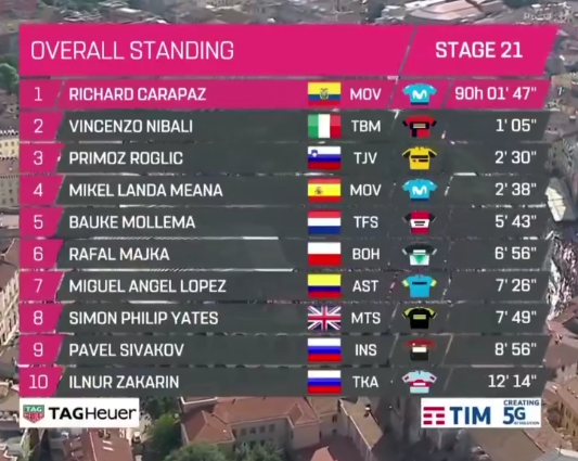 Le classement final de ce Tour d'Italie 2019 avec la victoire finale de Richard Carapaz devant Vincenzo Nibali et Primoz Roglic. Les Movistar auront dominé ce #Giro, avec Landa 4e. Déception pour Lopez et Yates, 7 et 8. Sivakov, prometteur, 9e.