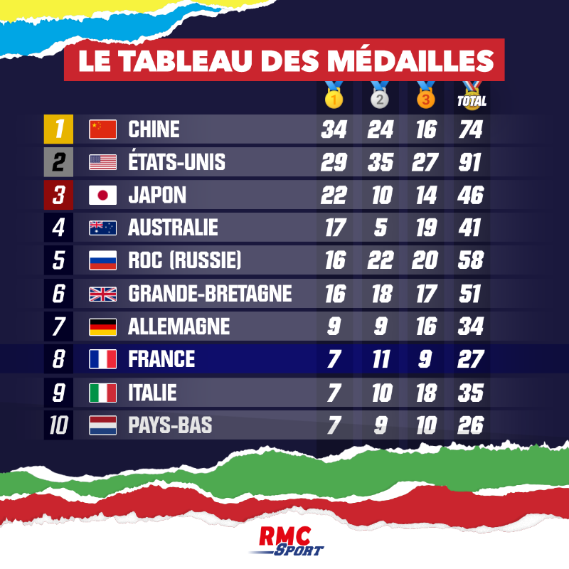 La Chine garde toujours la tête avec le plus grand total de médailles d'or - 34