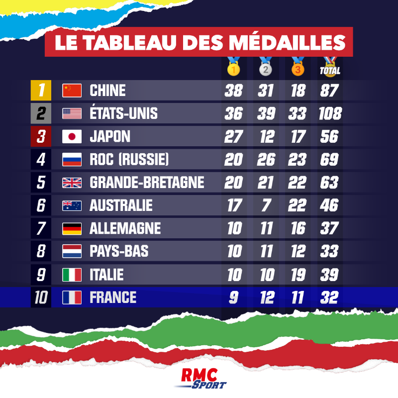 Malgré deux superbes médailles d'or en hand et volley, la France stagne à 10e place mais pourrait remonter en cas de nouvelles breloques en hand et cyclisme sur piste dimanche.