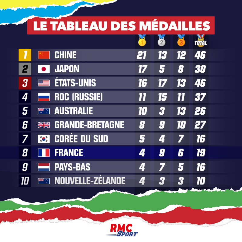En tête, la Chine conforte son avance avec 46 médailles au compteur, dont 21 en or.