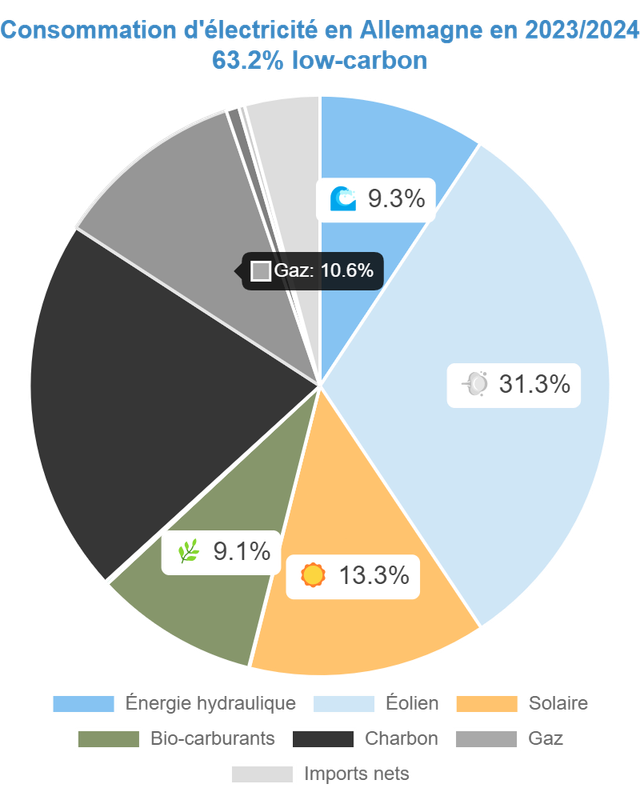 Cas de l'Allemagne: 63,2% de bas carbone et 280,13 g de CO2eq/kWh.
