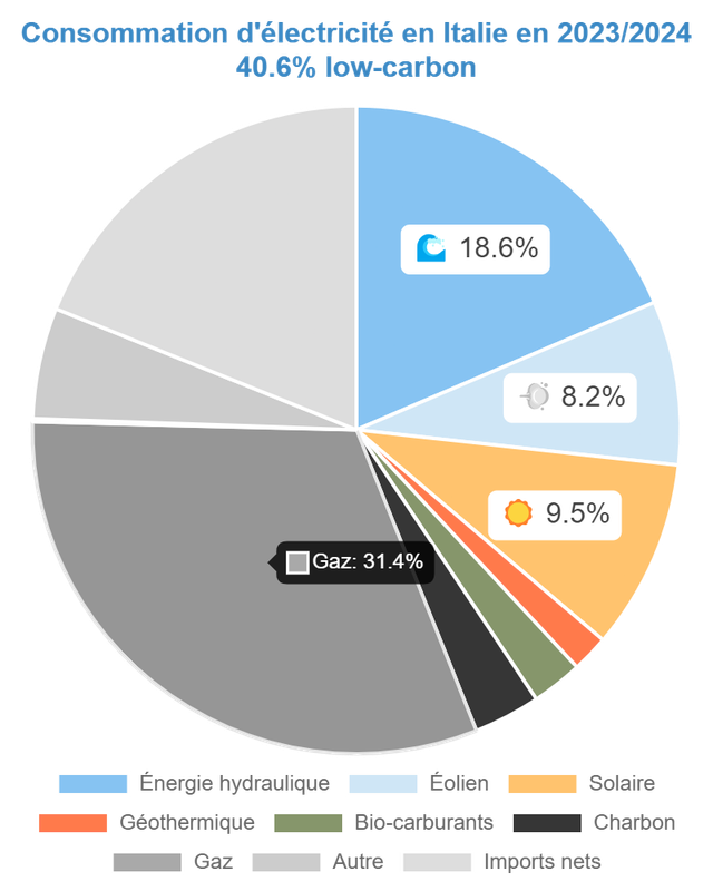 Cas de l'Italie: 40,6% de bas carbone et 301,36 g de CO2es/kWh.