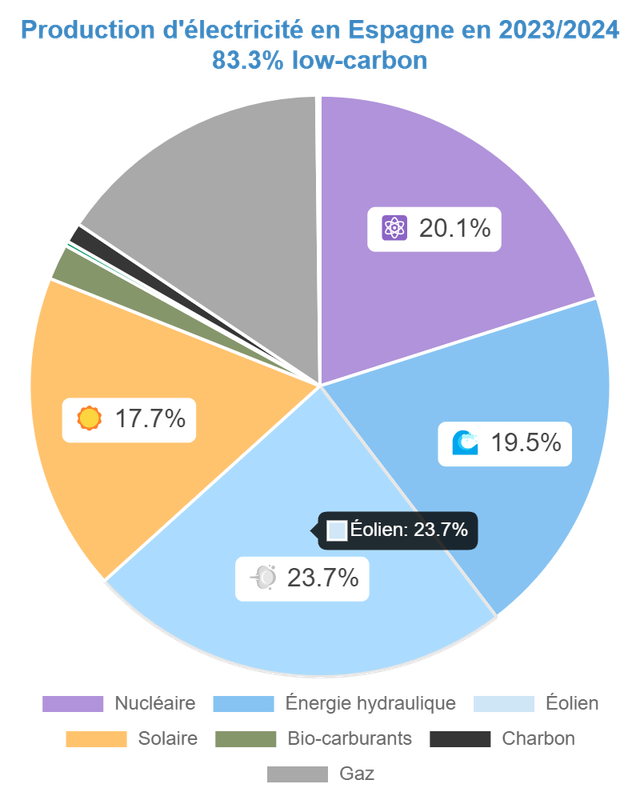 Cas de l'Espagne: 83,3 % d'électricité bas carbone et 108,34 g de CO2eq/kWh.
