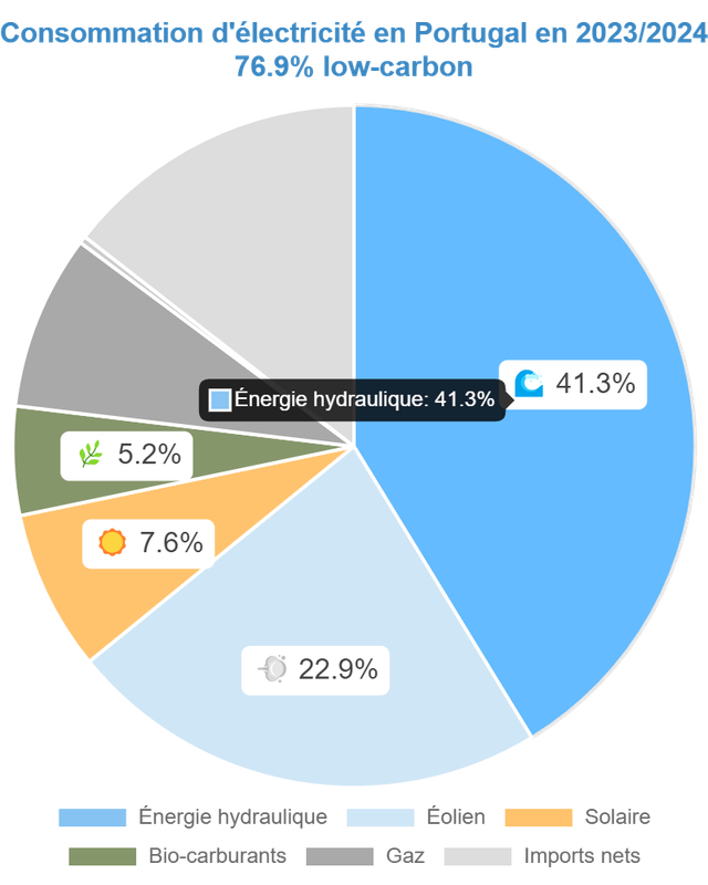Cas du Portugal: 76,9% de bas carbone et 130,81 g de CO2eq/kWh.