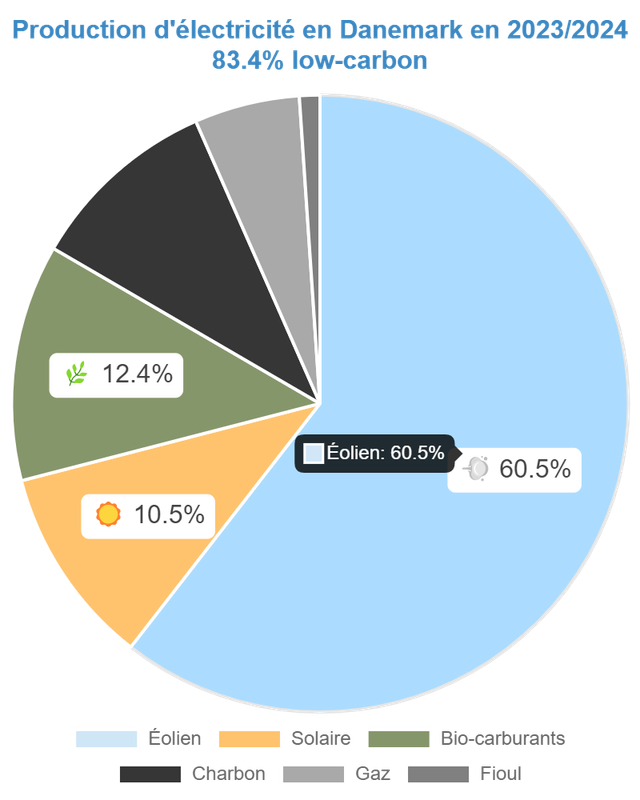 Cas du Danemark: 83,4% de bas carbone et 156,09 g de CO2eq/kWh.