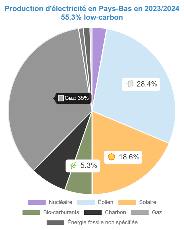 Cas des Pays-Bas: 55,2% de bas carbone et 269,80 g de CO2eq/kWh.