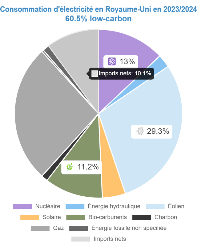 Cas du Royaume-Uni : 60,5% de bas carbone et 226,84 g de CO2eq/kWh.